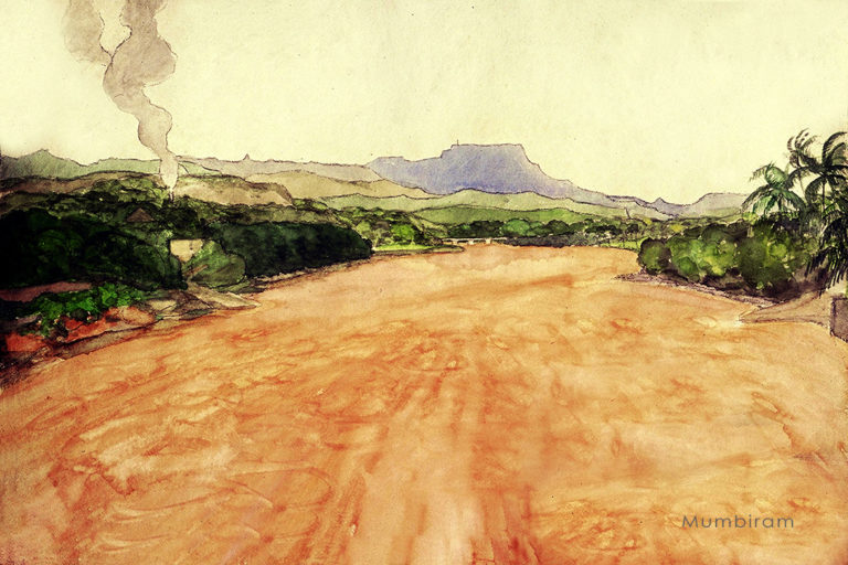 Mumbiram clearly had a wonderful time depicting these two trees. The way he has painted the Pimpal tree is simply wonderful. Call it pointilism or what you like. He clearly had a groovy meditation there. The other dark tree could be an Acacia Babhul tree or Tamarind Chinch tree judging from the compound leaves made of small elliptical components. The two trees look handsome together. Mumbiram sees everything has a personality. His brush can manifest those personalities.